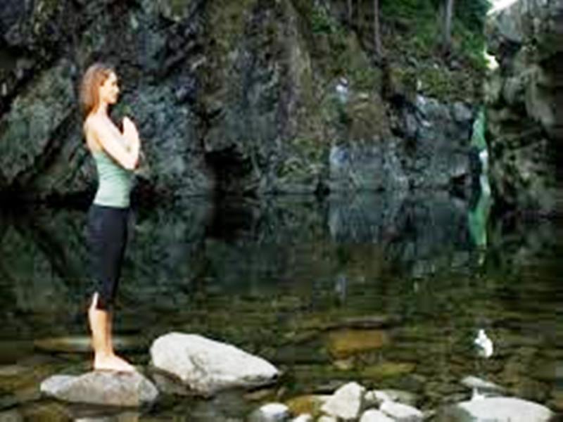 Rock your pelvis back and forth to see if you can find a place right in the middle, a place that feels “just right,” where your pelvis is just floating. Pull the tops of your shoulders back and broaden your shoulder blades across your back. Allow your arms to hang by your sides, palms facing forward, in a gesture of receiving. Gaze forward. Stand like a mountain.